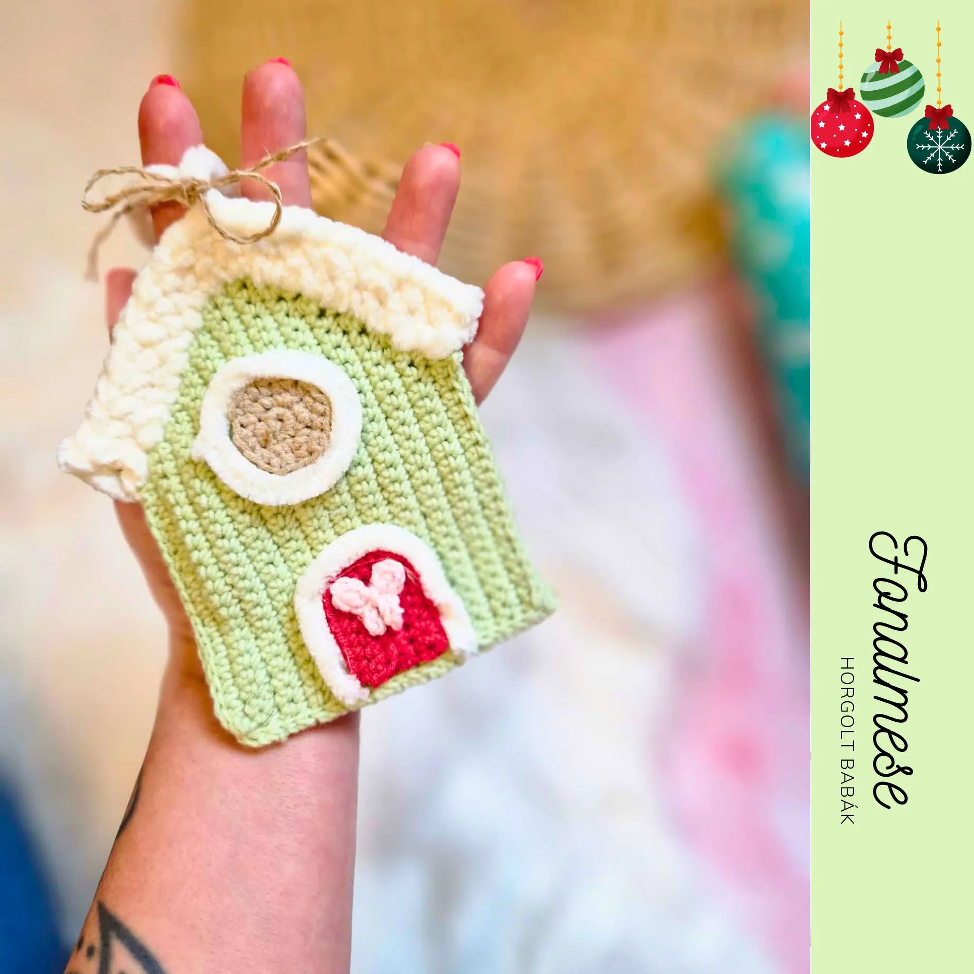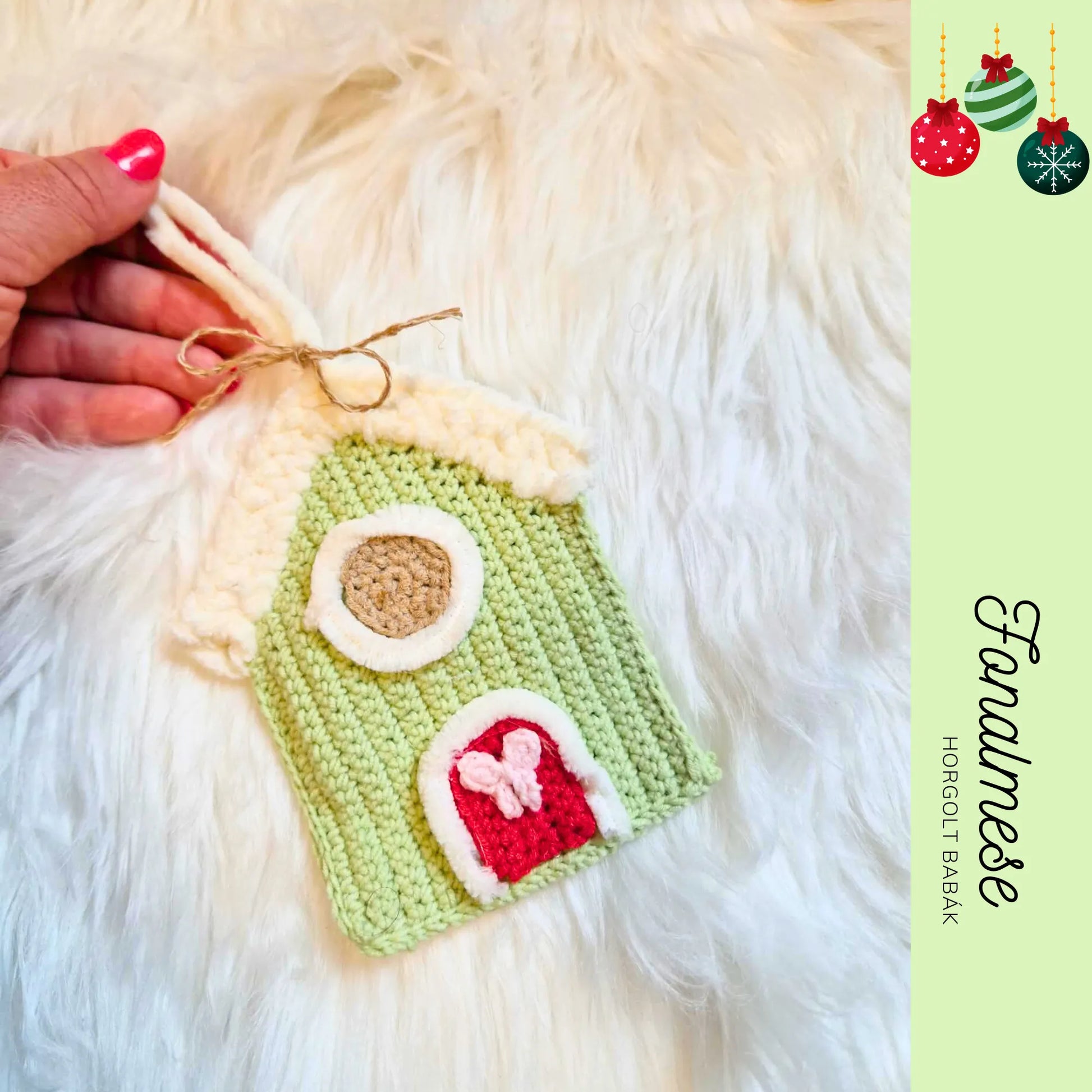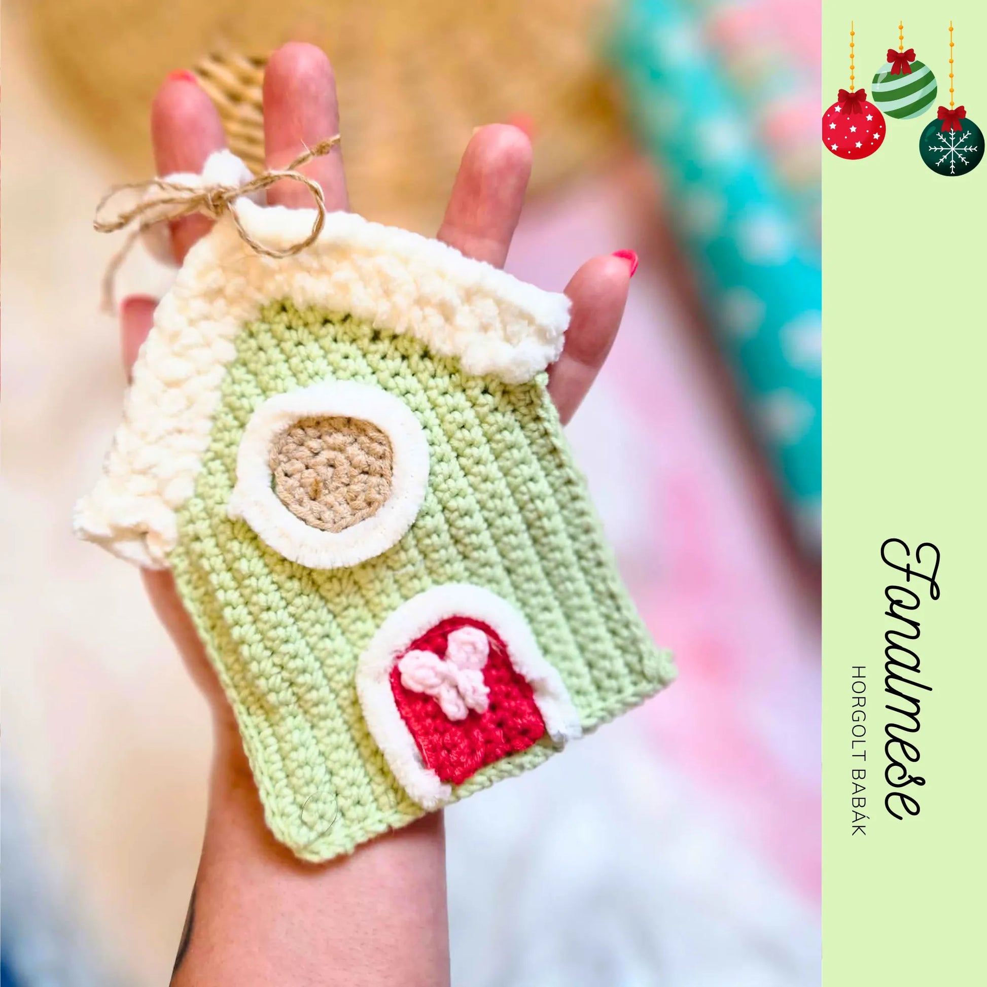 🎄 Horgolt Zöld Házikó Karácsonyfadísz – Téli, ünnepi hangulat kézzel készítve