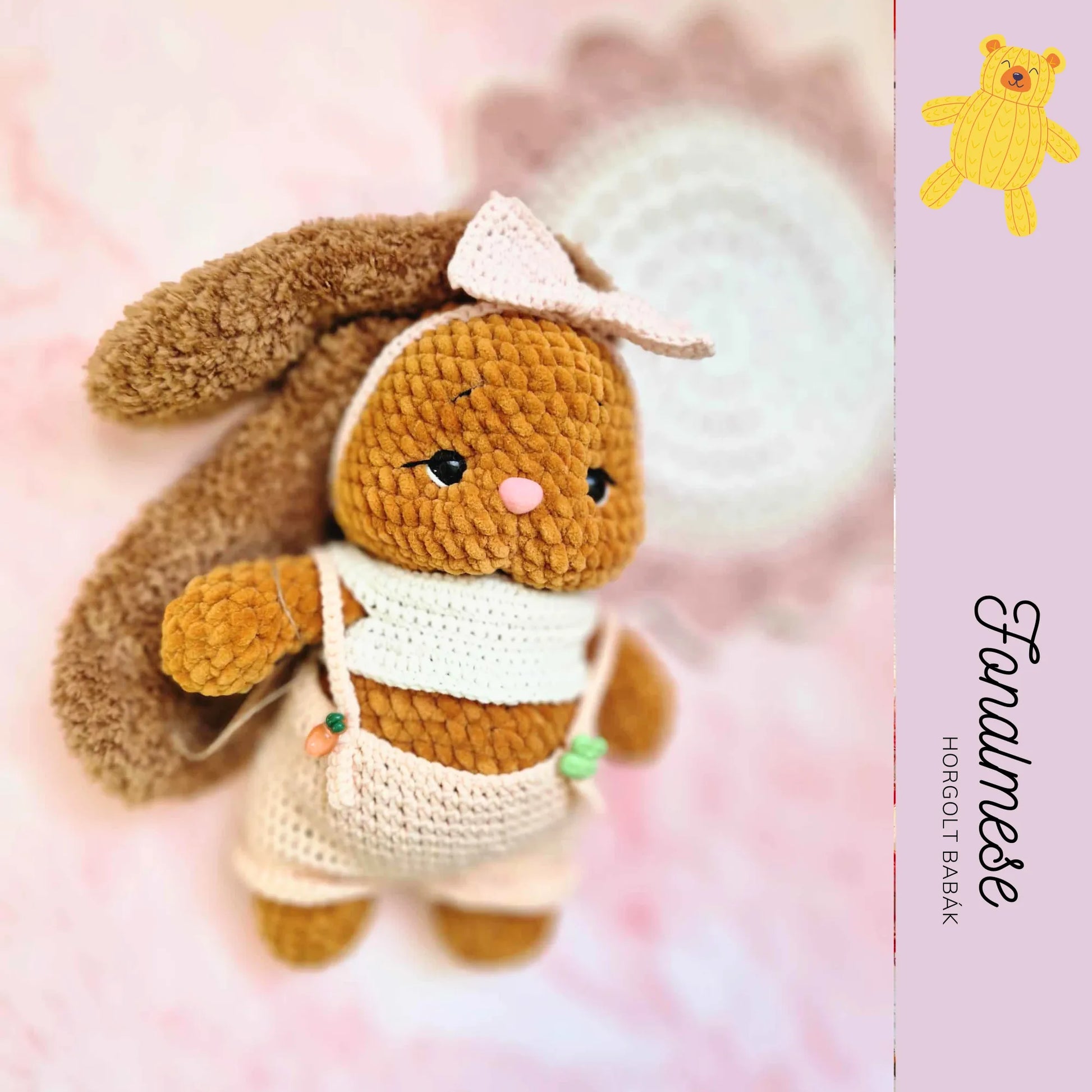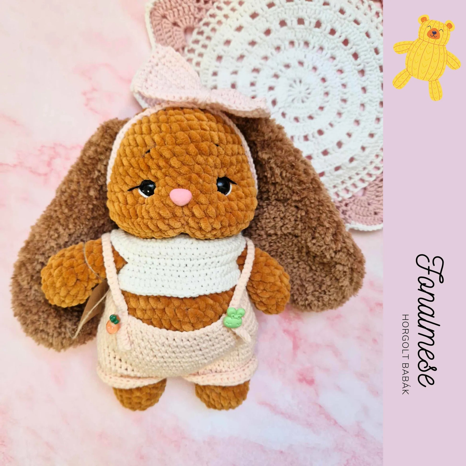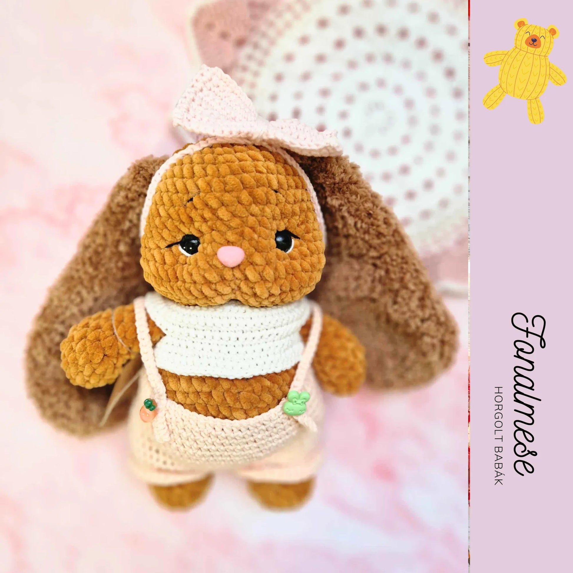 Ez a zseníliából készült nyuszi figura kedves és puha tapintású, aprólékosan kézzel készített alkotás. Fülén masni díszeleg, a fülei pedig enyhén bolyhosak, ami még bájosabbá teszi megjelenését. A figura levehető ruhát visel, így a kicsik könnyedén átöltöztethetik, ami játék közben fejleszti a kézügyességet és a kreativitást. A nyuszi ideális játékra vagy dekorációnak, szerethető és ölelni való társ minden korosztály számára.