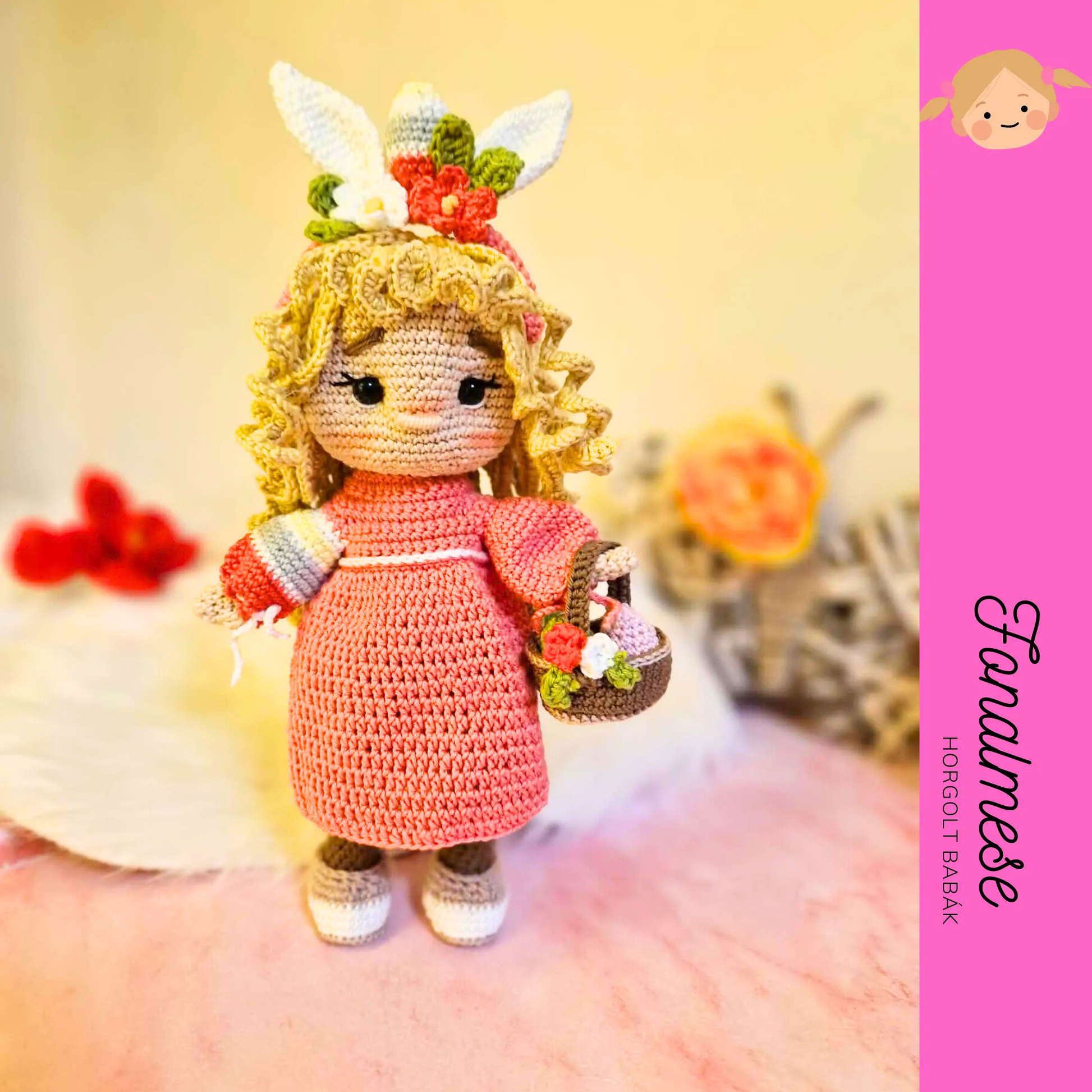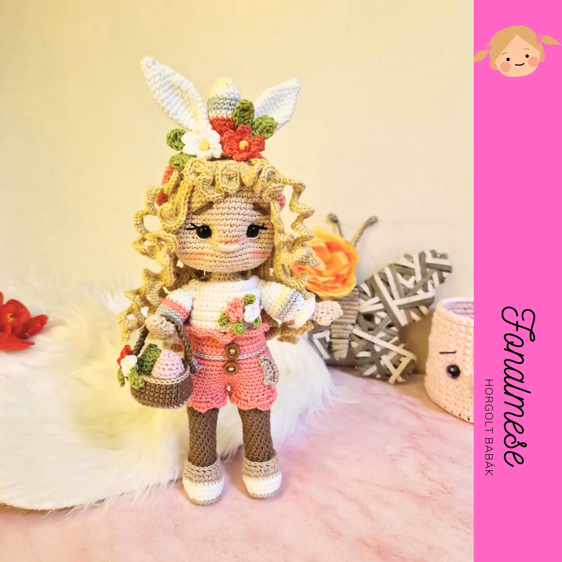 Ez a részletes horgolási minta egy bájos, húsvéti hangulatú babához készült, amely kb. 28 cm magas, szőke, göndör hajú, és különleges kiegészítőkkel rendelkezik. A baba nyuszifüles hajráfot visel, kis kosárral rendelkezik, valamint két különböző ruhával is elkészíthető, így igazán sokoldalú és variálható alkotás születik belőle.