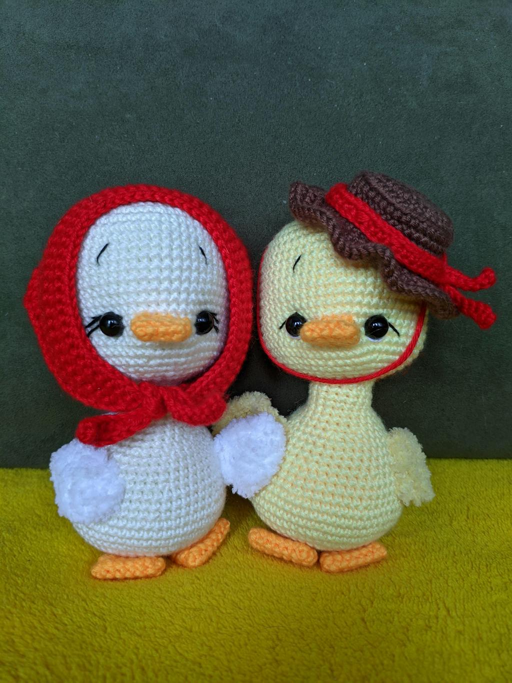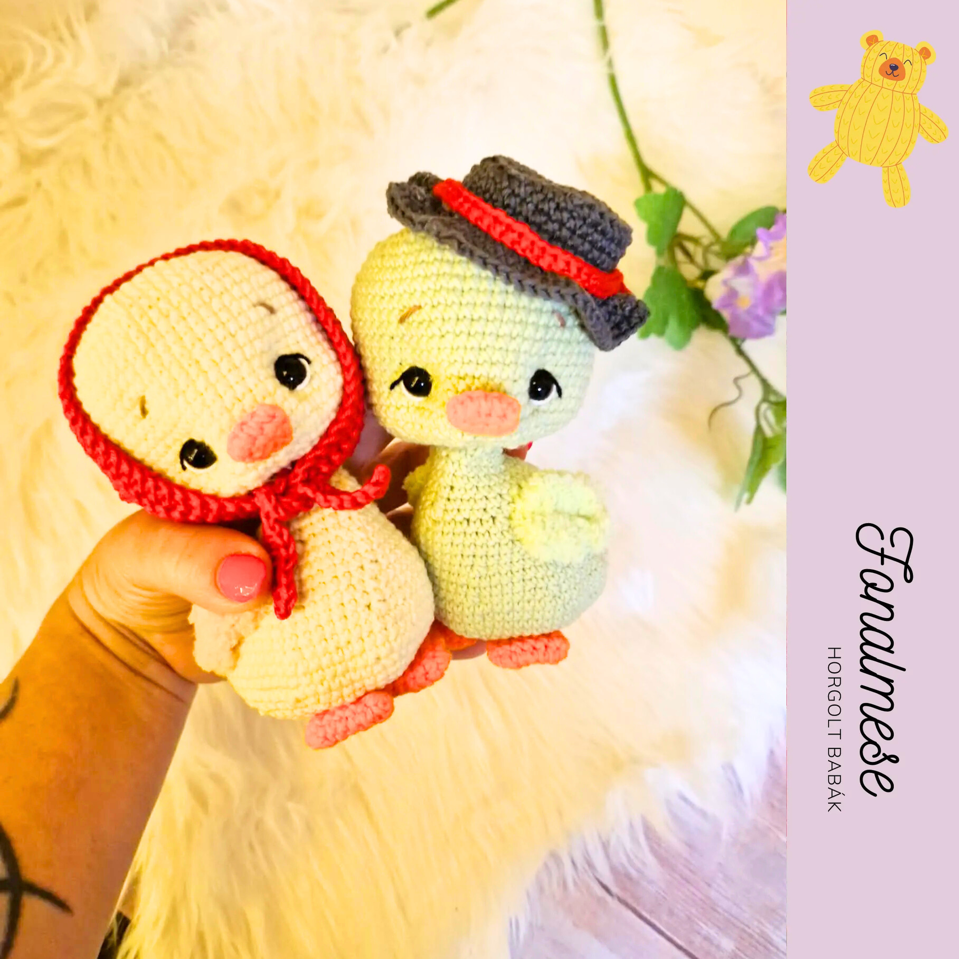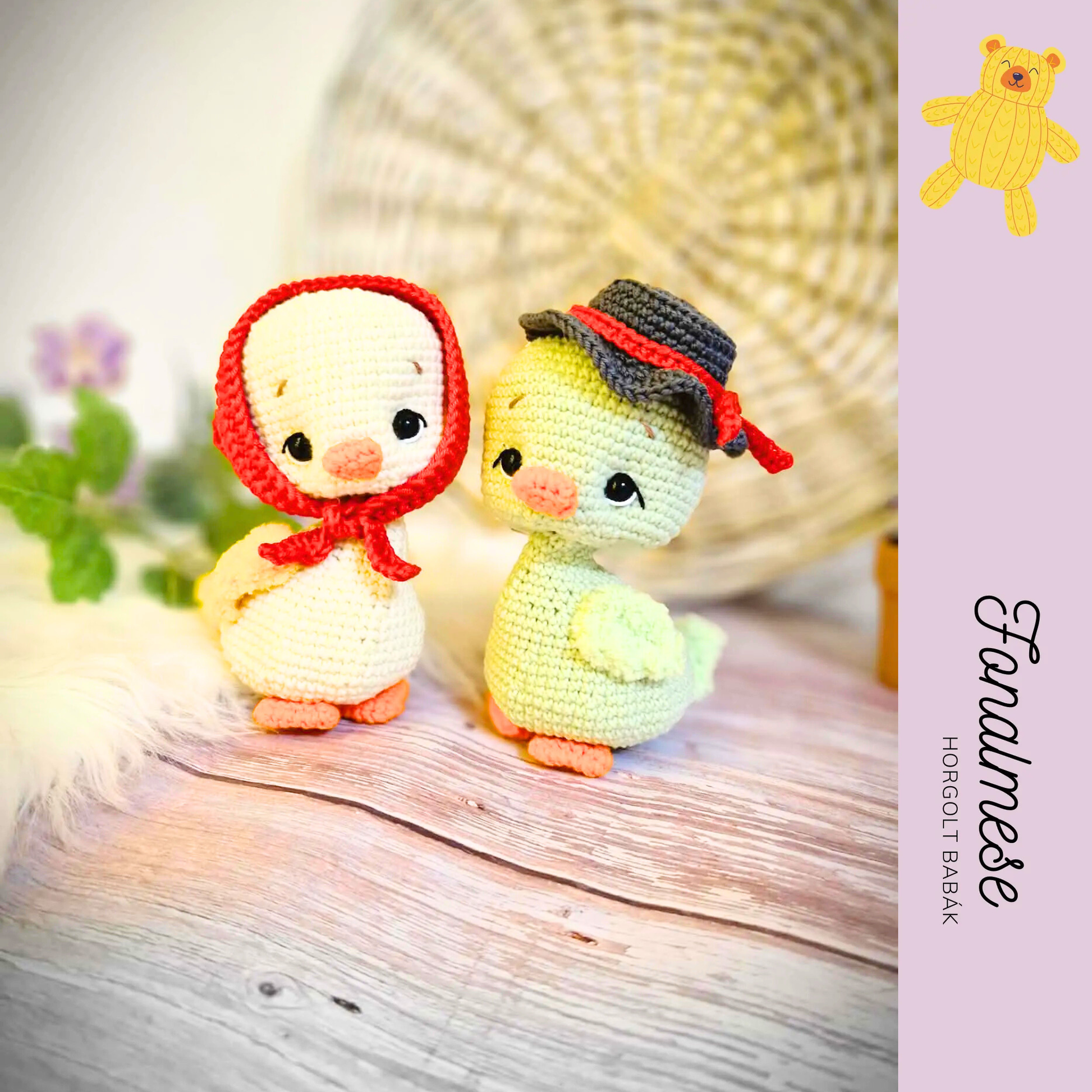 Ez a bájos kis kacsapár igazi tavaszi hangulatot áraszt. A világos sárga és halvány zöld színekben készült figurák kedves, harmonikus megjelenésűek. A kislány kacsa apró piros kendőt visel, míg a fiú kacsa aranyos kalappal egészül ki.