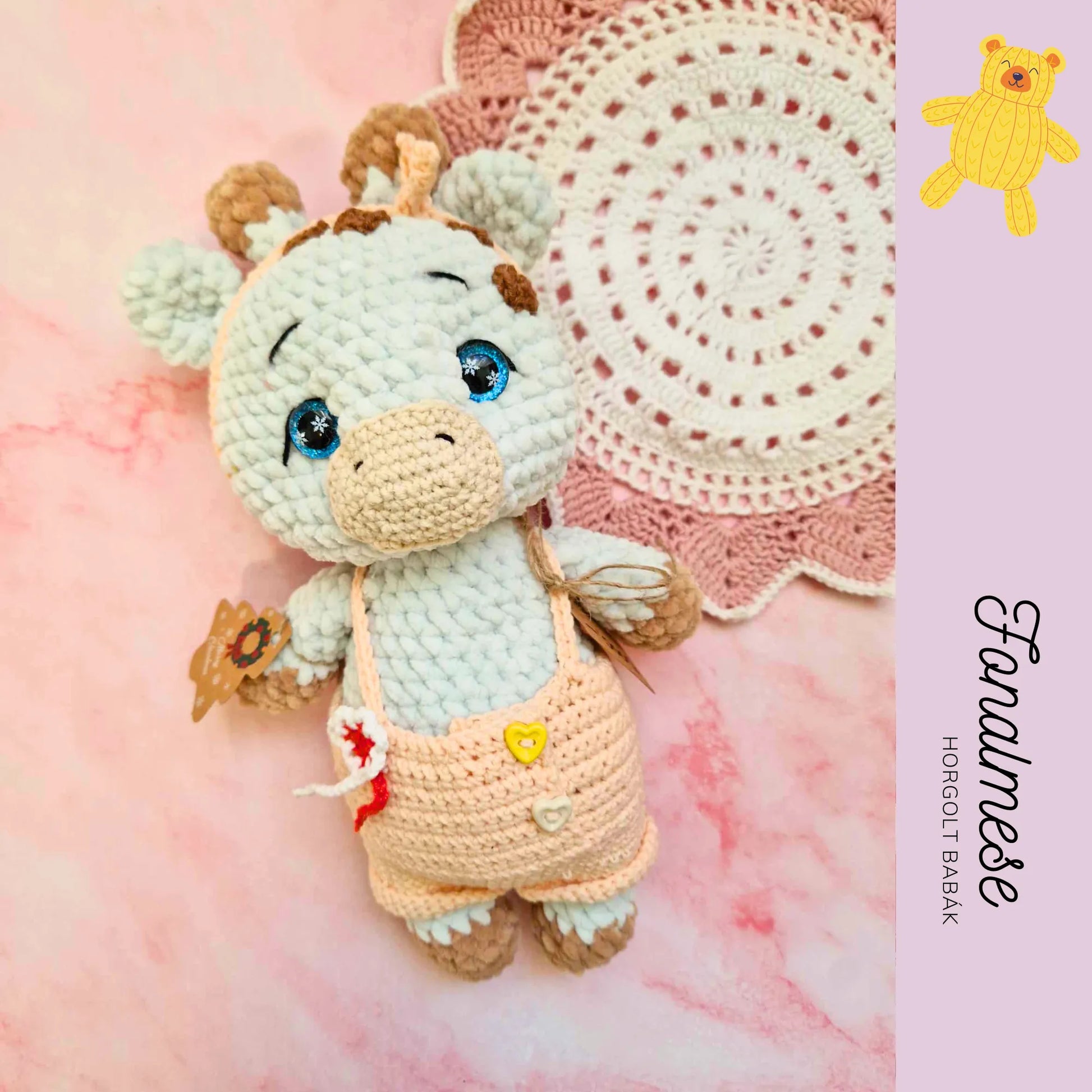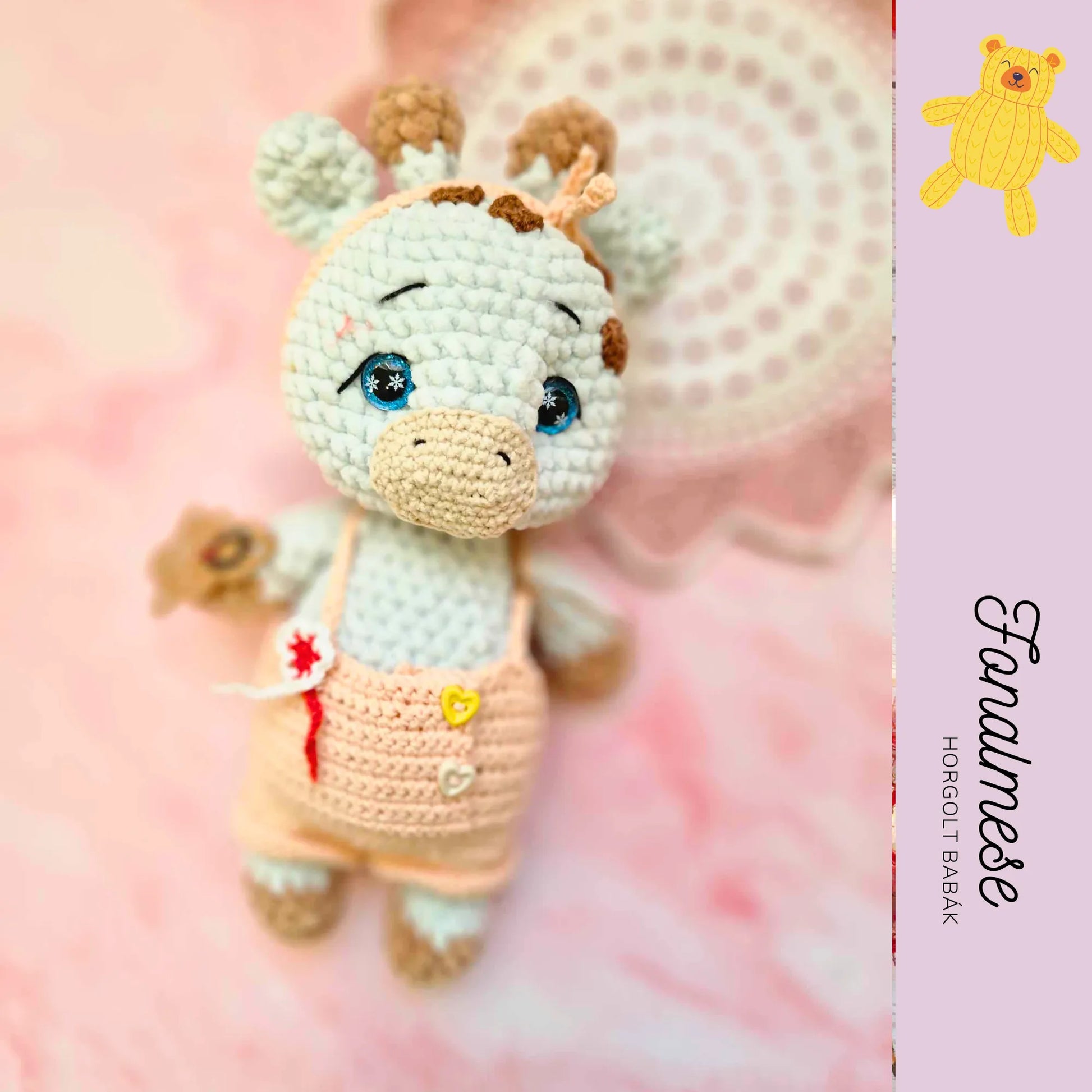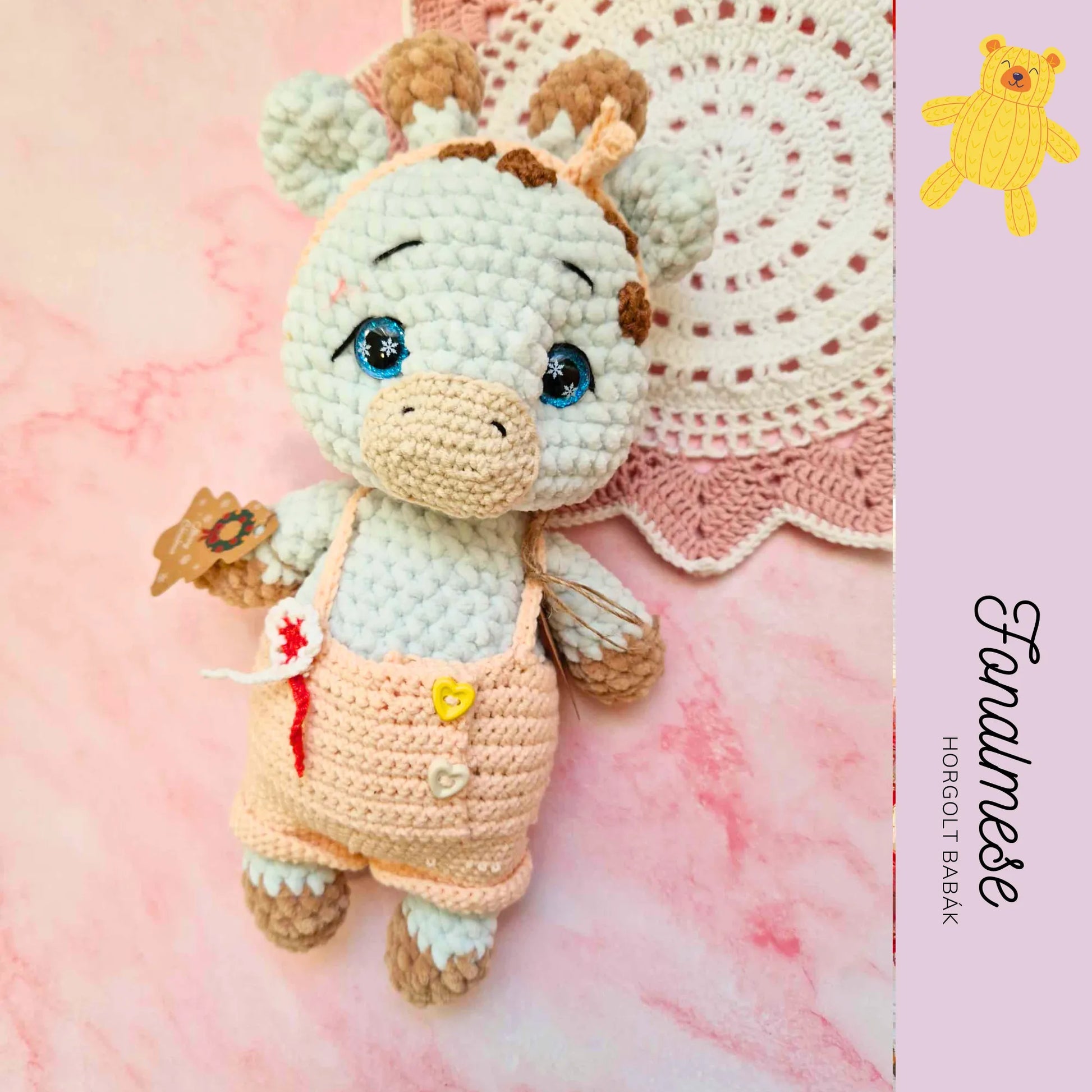 Ez a zseníliából készült kislány zsiráf kedves, puha tapintású figura, aki aprólékosan kézzel készült. Vidám megjelenését élénk színek és bájos részletek teszik egyedivé, így tökéletes játék- vagy dekorációs tárgy a gyerekszobában. A figura ölelhető és teljesen puha, így biztonságos a kicsik számára, miközben barátságos megjelenésével szerethető társ minden korosztály számára.