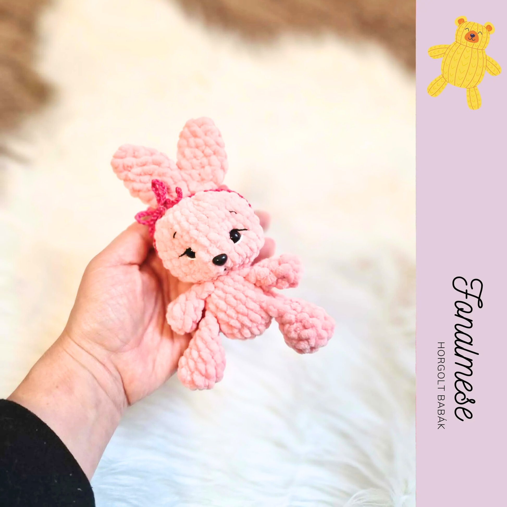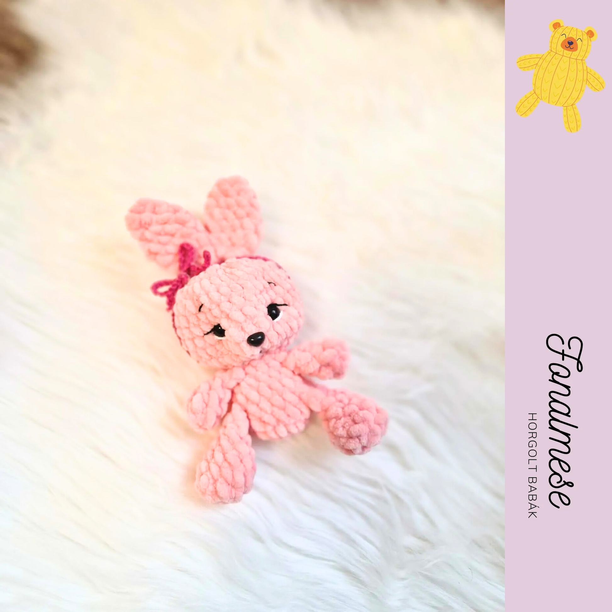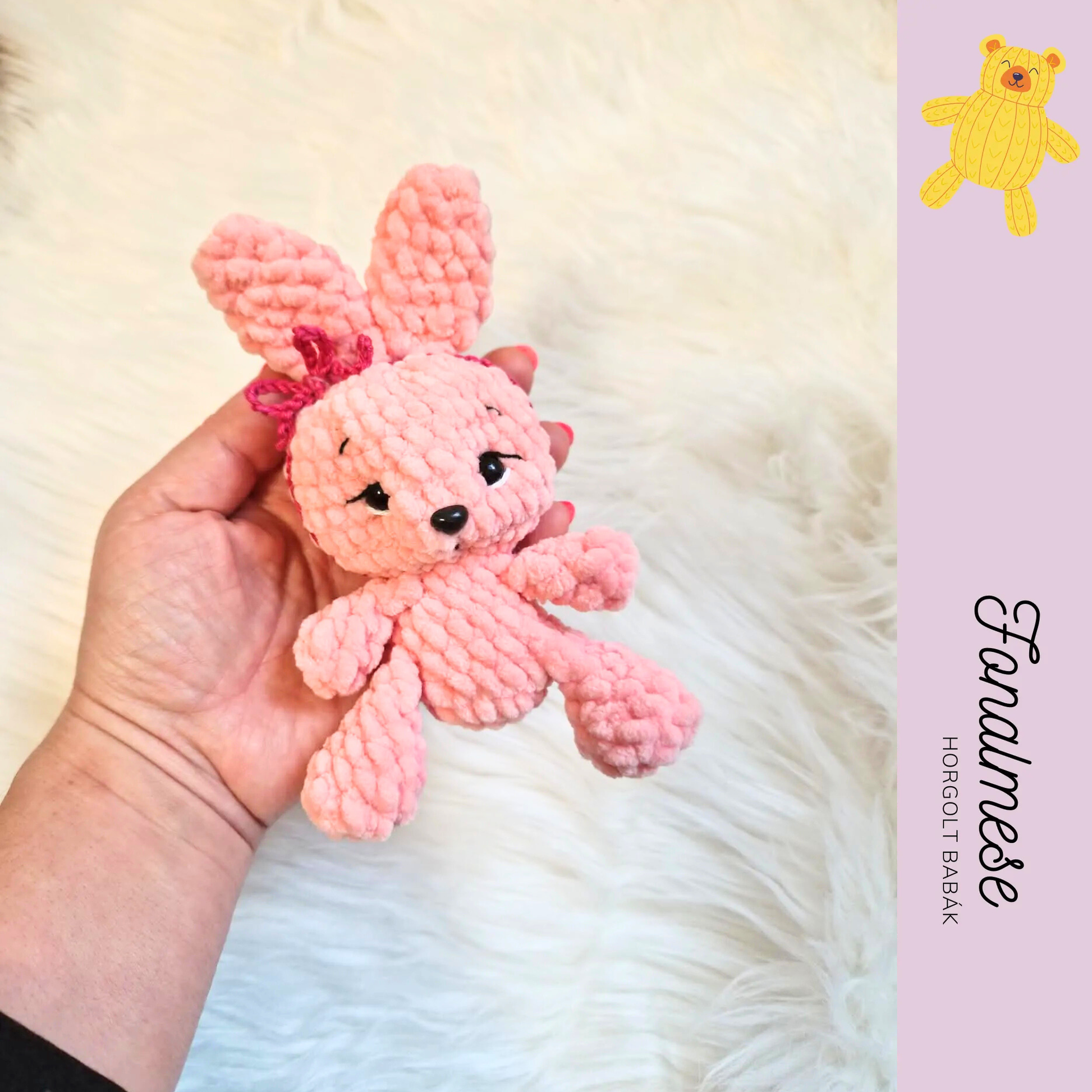 Rózsaszín, zsenília fonalból horgolt nyuszi, 17 cm magas, különlegesen puha és ölelgetnivaló. Kedves megjelenésével tökéletes apró ajándék vagy bájos dekoráció. 🐰💗