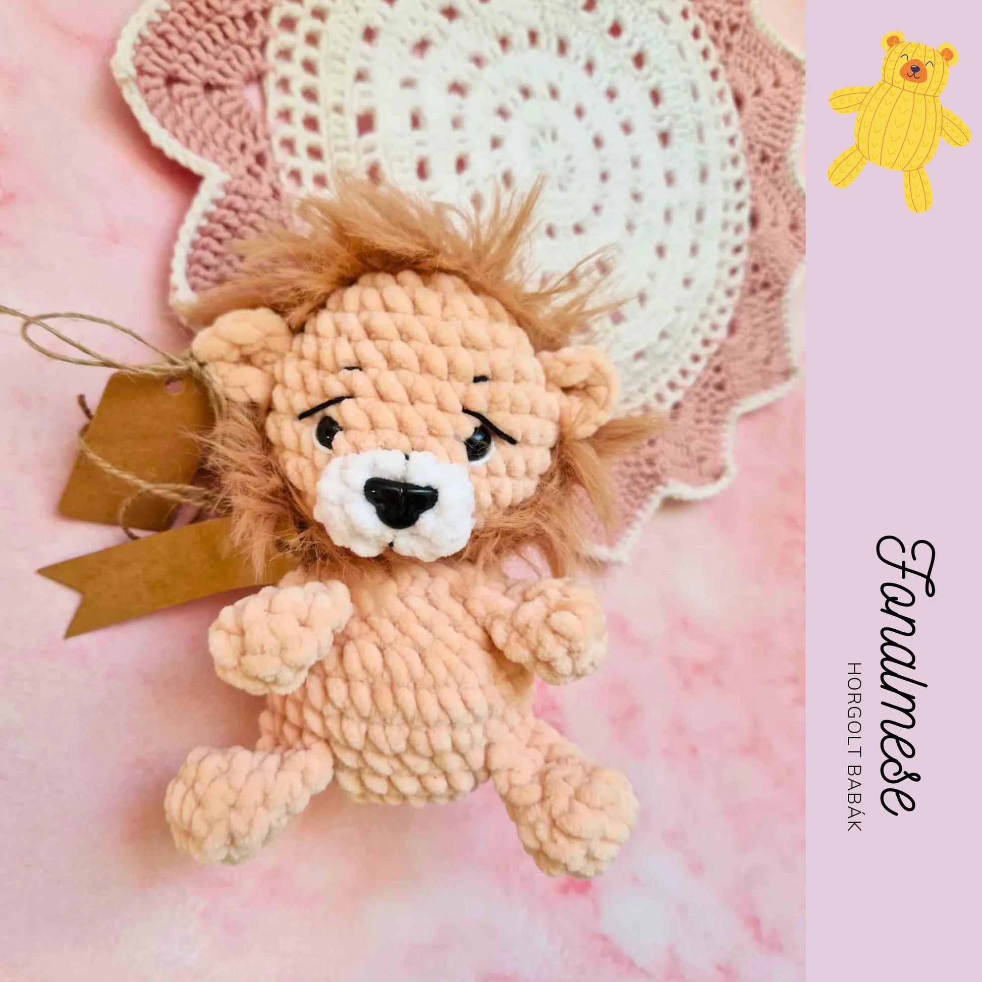 Ez a zseníliából készült mini oroszlán figura apró, kedves és ölelhető, kényelmesen elfér a tenyeredben. Puha tapintású és kézzel készített, így biztonságos a gyerekek számára, miközben vidám, játékos megjelenésével elvarázsolja a kicsiket. Ideális gyerekszobai dekorációnak, játékba vagy apró ajándéknak, szerethető kis társ minden alkalomra.