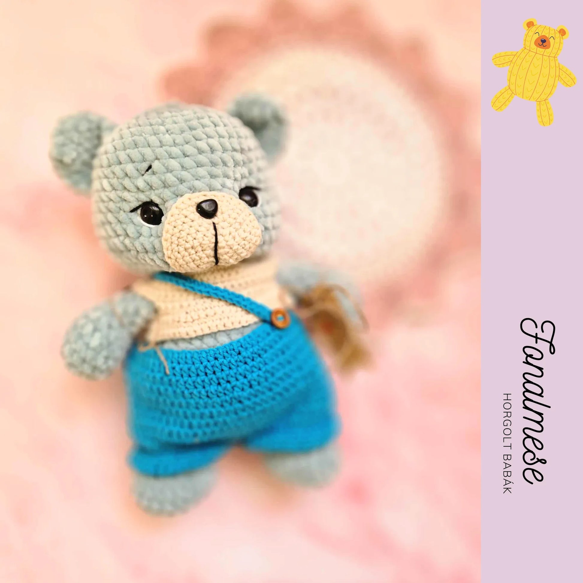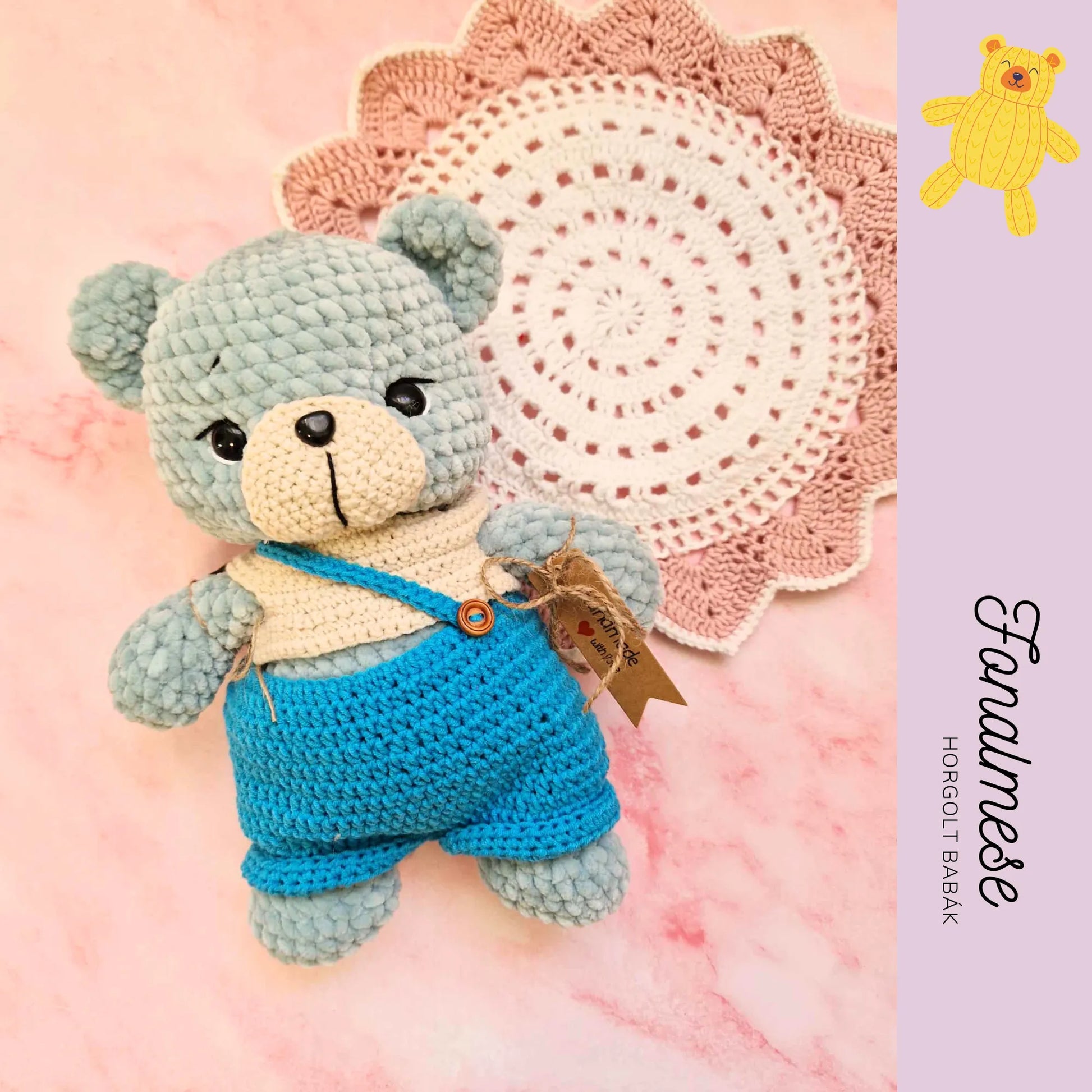 Ez a kézzel készült mackó kedves és puha tapintású figura, aki kék nadrágot visel, amely levehető, így a kicsik könnyedén átöltöztethetik kedvencüket. A mackó ölelni való, szerethető karakter, aki játékra és dekorációra egyaránt alkalmas. A mozgatható ruházatnak köszönhetően fejleszti a gyerekek kézügyességét és kreativitását, miközben biztonságos és tartós anyagból készült.