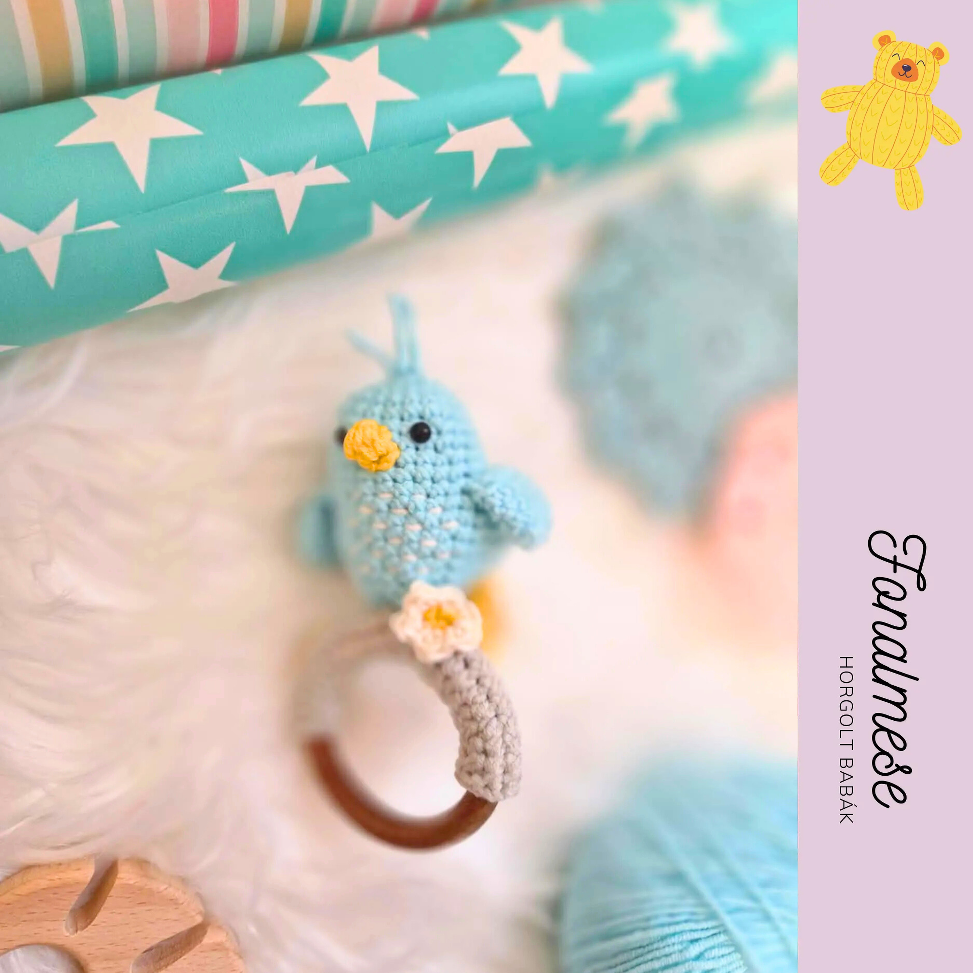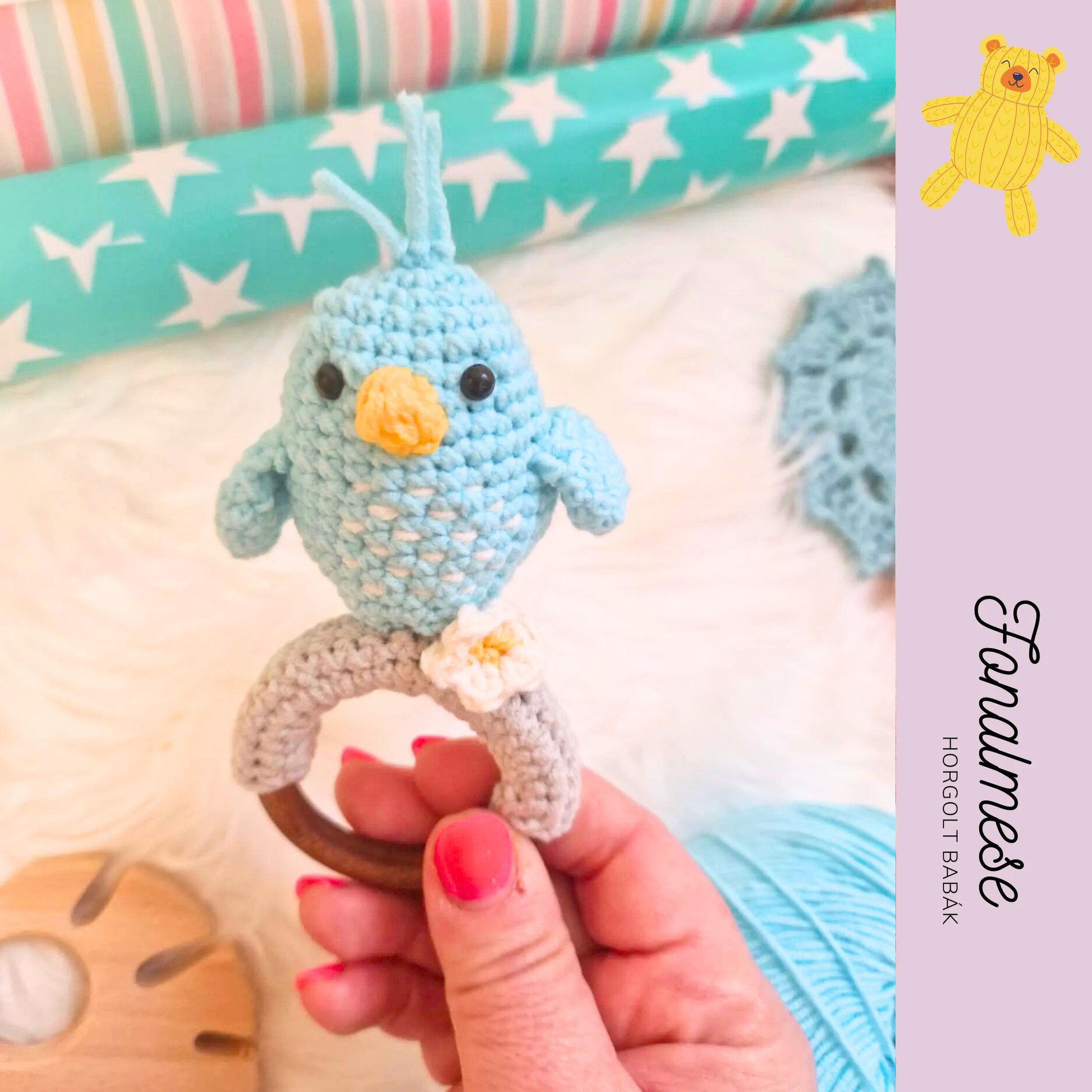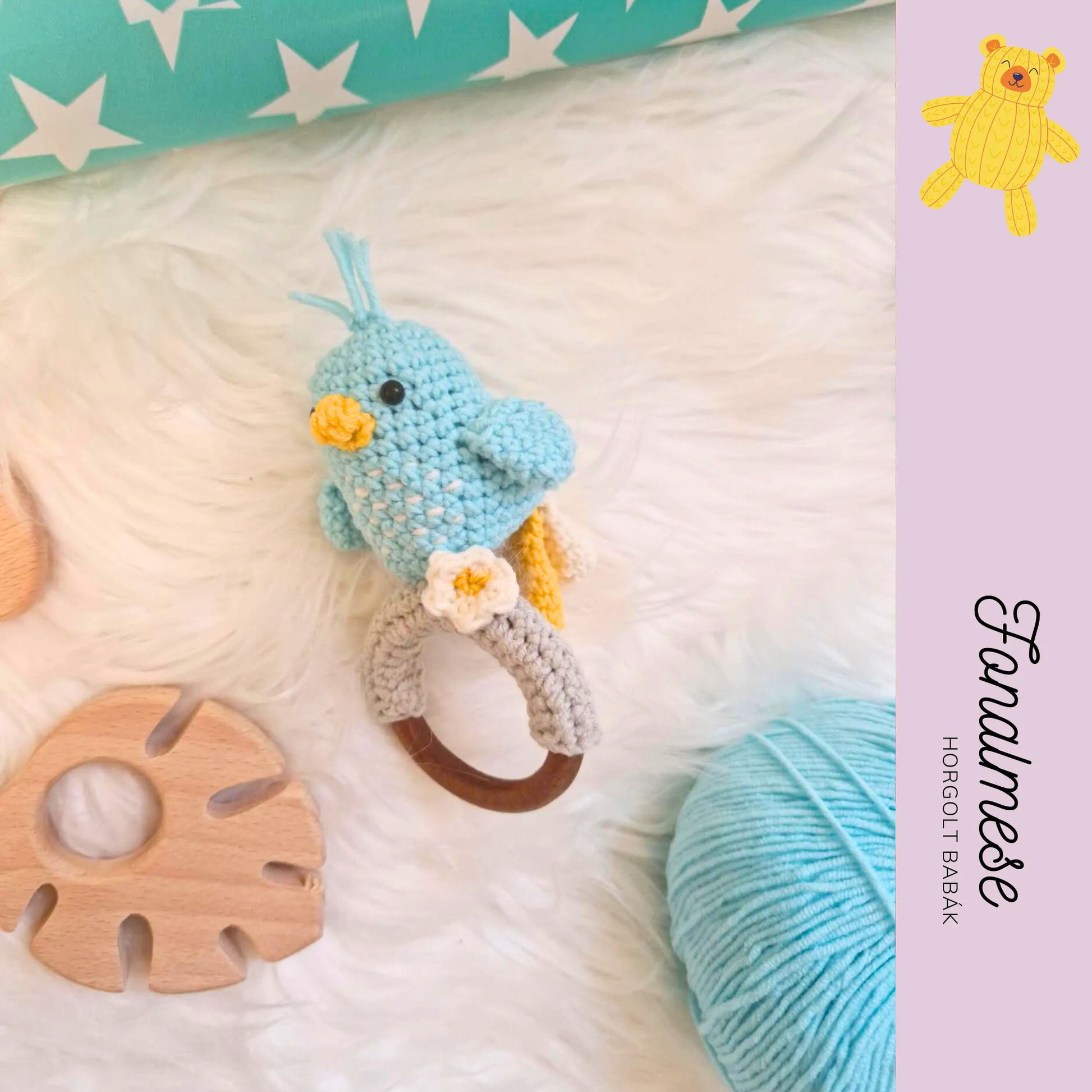 Ez az aranyos, türkiz színű horgolt madár csörgő kifejezetten a legkisebbek számára készült. Puha tapintású, könnyen megfogható, belsejében csörgő található, amely finom hangjával felkelti a baba figyelmét és segíti az érzékszervi fejlődést.