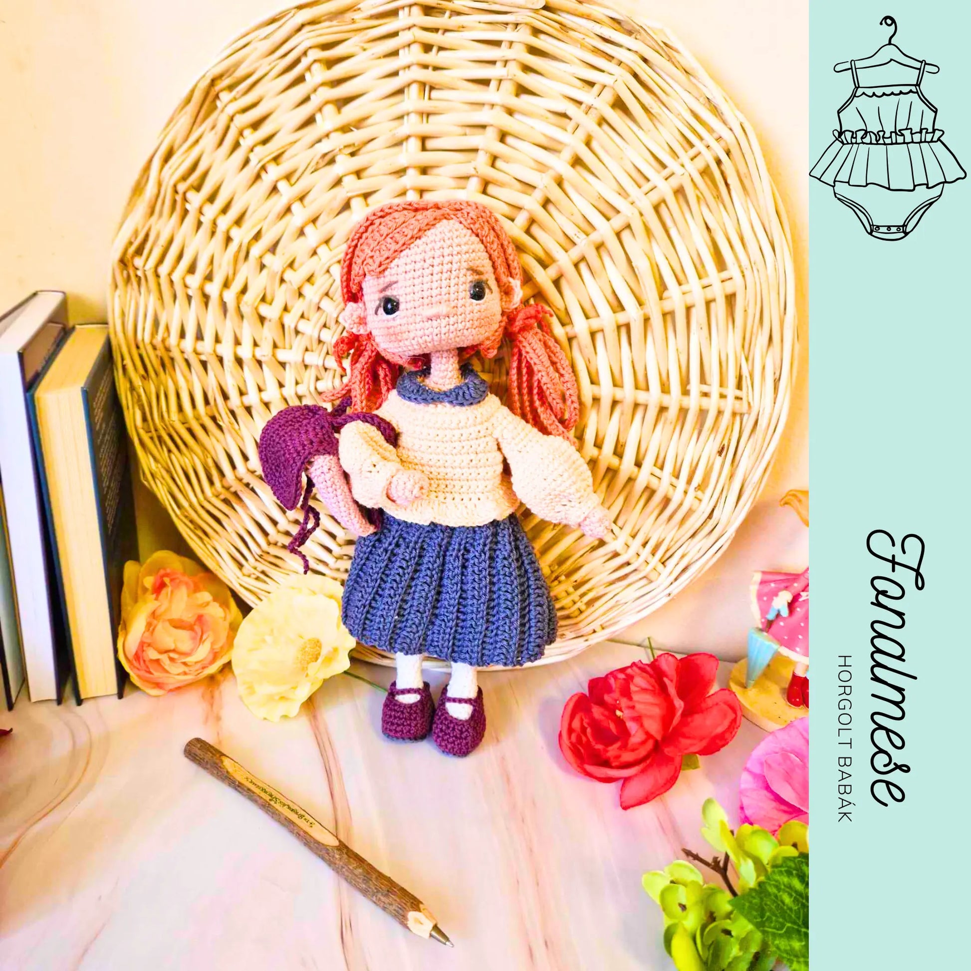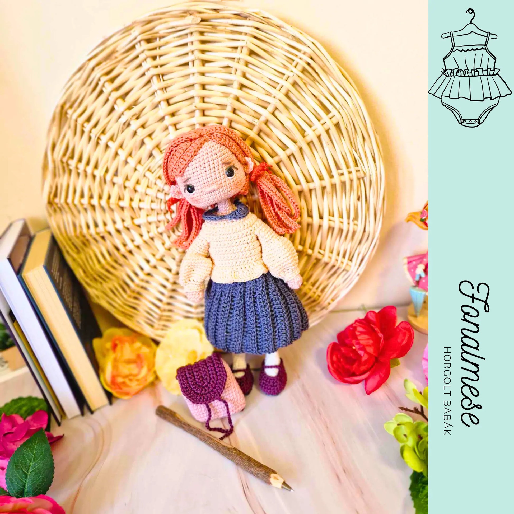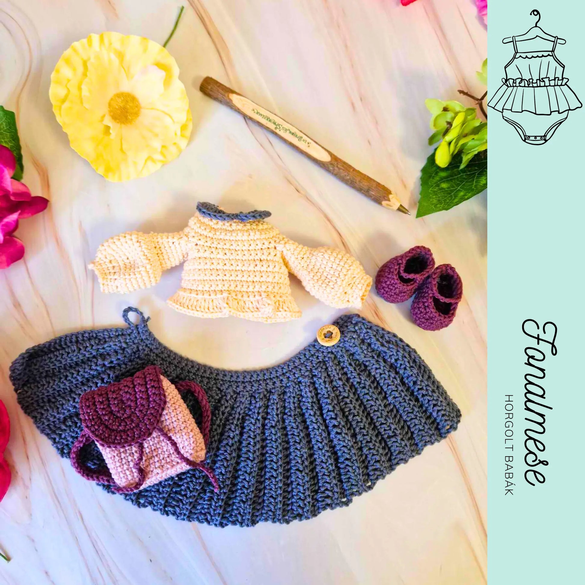 Zizi iskolás ruha szettje, egy szívmelengető horgolós projekt. Csodás ajándék, vagy bájos darab lehet a kézzel készült baba ruha gyűjteménybe! 🧸
